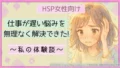 仕事とHSP 無口で雑談が苦手なHSP女子の体験談|職場での人間関係をラクにするヒント 無口で悩むHSP女性へ。仕事の場で無口になりやすい理由や、仕事で信頼を築きながら働くための具体的なコミュニケーション方法を体験談をもとに紹介しています。 2025.09.21 仕事とHSP
